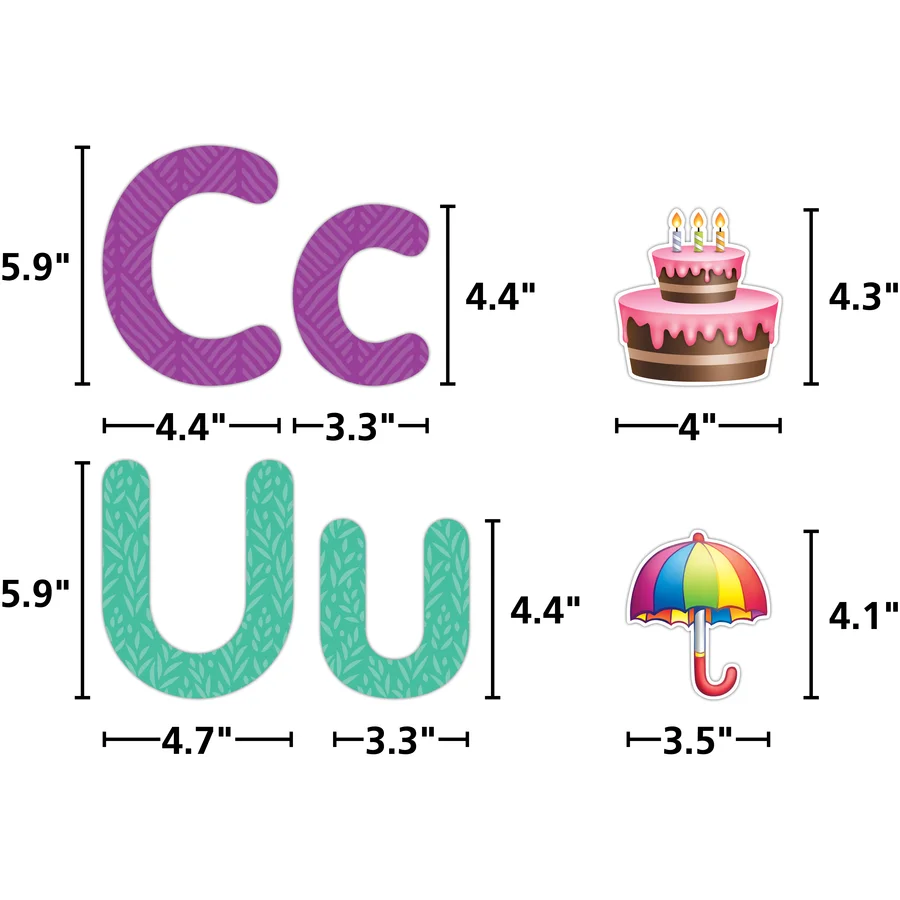 Brighten up your classroom with this vibrant alphabet bulletin board featuring bold, colorful letters paired with a coordinating illustration for each one! Each letter is brought to life with a playful image that helps reinforce letter recognition. Perfect for early learners, this engaging and educational set adds a fun touch to any classroom or learning space. Letters are 5¾" tall and the illustrations range from 3" to 6". 78 total pieces.