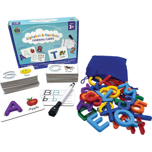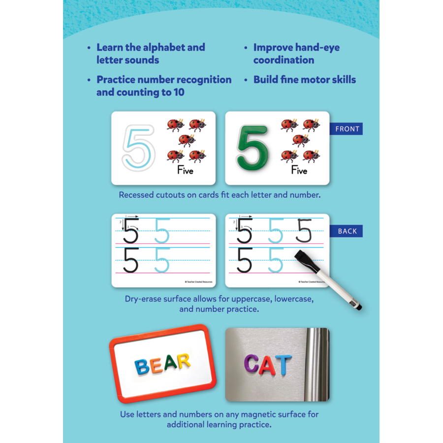 Help children learn letters and numbers through play and practice with this collection of multi-use learning cards. Children can begin by tracing each letter and number with their fingers, and then challenge themselves to find the magnetic letter or number that correctly fits in each recessed area. Turn the card over to use the write-on/wipe-off surface to practice writing letters and numbers over and over again. Letters and numbers will stick to any magnetically receptive surface for further learning and play.