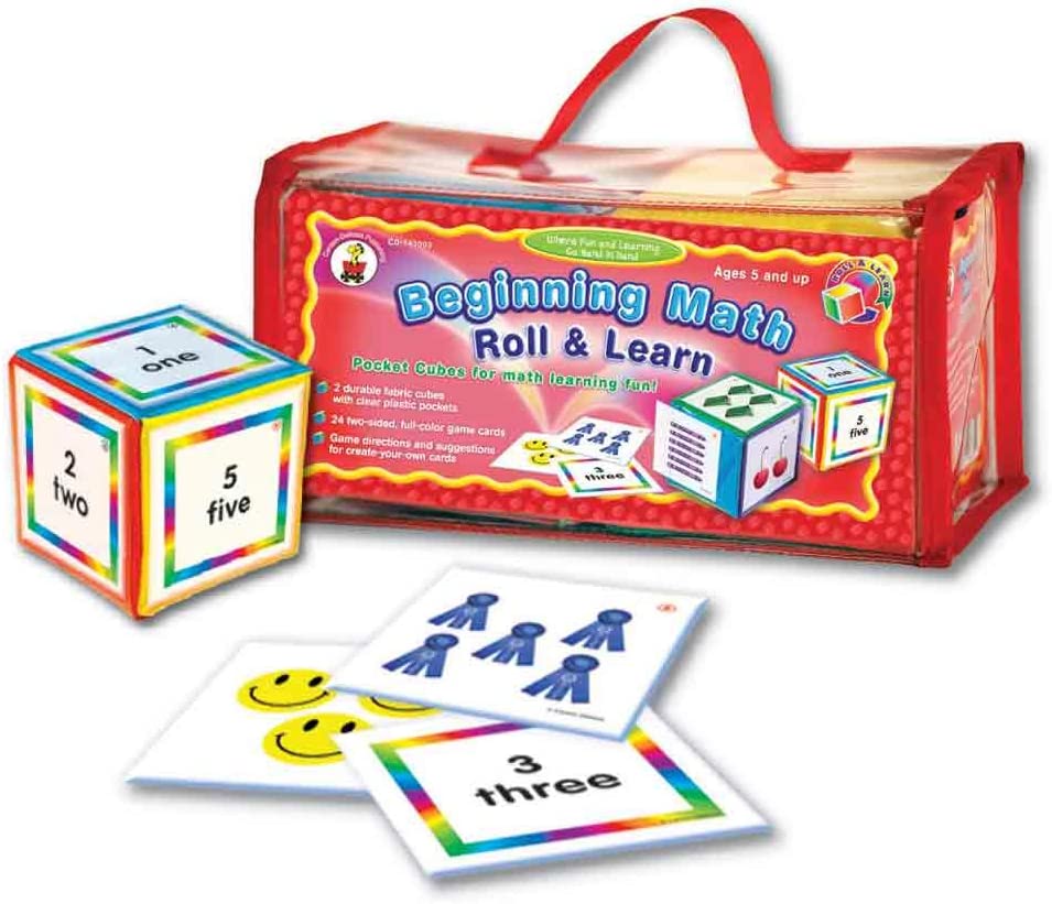 Beginning Math Roll & Learn Pocket Cubes | Games 2 cubes, 24 2-sided game cards, 1 resource guide - Grades K - 2 Here's an innovative new way to learn Beginning Math skills, plus, as an added bonus, your students will have so much fun they won't realize how much they're learning! Rather than the same old boring drills, numerous worksheets, or endless practice exercises, introduce your students to an exciting new way of learning with the Roll & Learn Pocket Cubes. The set includes: two pocket cubes made of the same durable material as our pocket charts, 24 learning cards, and a resource guide. The learning cards are designed to slide easily into plastic sleeves that are located on each side of the cube. Each card has either a photograph or colorful text printed on it. The game instructions vary depending on the skill being taught that day. Some games require both cubes being tossed, while others have students toss one cube and find the correct answer on the remaining cube. The games include: numerals and number sets, shapes, numbers comparisons, as well as simple addition. These games can be played with either the whole class or placed in a learning center for small group or individual play. This set is a terrific tool for teaching with a kinesthetic approach.
