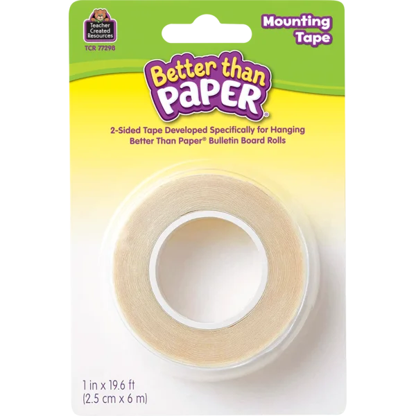 Securely hang your bulletin board rolls with this high-tack double-sided adhesive. This mounting tape is specifically designed to hang Better Than Paper® from virtually any surface! Use it on painted brick, painted walls, fabric bulletin boards, cloth cubical walls, whiteboards, wood trim, plastic surfaces, metal doors, and much more! Also works with butcher paper, construction paper, and other types of bulletin board paper. Measures 1 in x 19.6 ft.