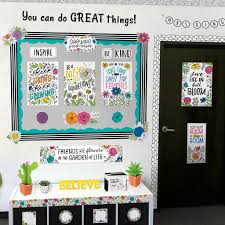 Growing great minds is the theme of this Blooming Minds Bulletin Board. Pieces offer encouraging tips for student success and a place for recording class goals. The fresh, casual design features flowers in slightly pastel colors popping on a white background, perfect for brightening any space.