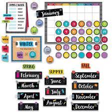 The Bold & Bright Calendar Set Bulletin Board features bold black and white contrasted by pops of bright colors. Stripes, dots, and spots combine with playful school supply accents such as binder clips, push pins, sticky notes, and corkboard to add color and texture to this modern look. This 67-piece calendar set includes a calendar chart, 12 month headlines, 31 pre-numbered calendar days, and 4 blank calendar days. The set also includes a days-of-the-week chart, a seasons and weather chart, and coordinating labels. The bright colors and modern design make this set perfect for children and adults of all ages.