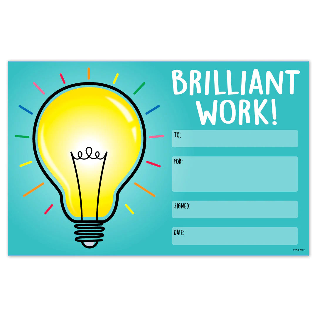 Shine a light on a job well done with these Brilliant Work! Awards. Featuring a bright yellow lightbulb, each award is a fitting certificate for children in a wide range of age or grade levels. Awards are easy to customize for each student and special achievement. Awards are printed on sturdy paper stock so they can be enjoyed for years to come.
