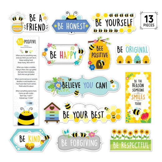 The Bee Positive Mini Bulletin Board is filled with affirmations to help learners be successful, happy, and kind. The friendly bees and encouraging messages, make this set perfect for use in any school, office, church, dormitory, or senior living residence setting.