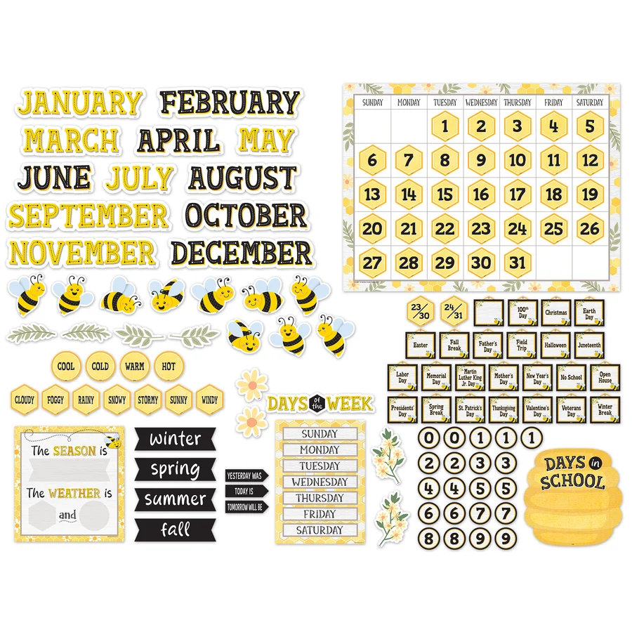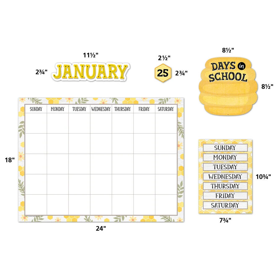 This vibrant and zippy calendar display comes with easy-to-read number pieces, colorful monthly headers, and additional pieces for holidays and special occasions. It also includes pieces for counting the days of the school year, as well as pieces for the weather, seasons, days of the week, yesterday, today, and tomorrow. Blank calendar measures 24" x 18". 131 total pieces.