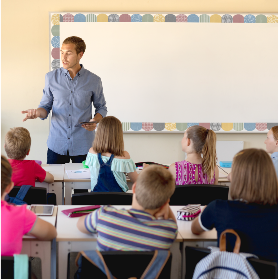 Use this classroom cottage scalloped border trim to liven up your classroom! Create fresh looks for bulletin boards, windows, walls, and class projects. Mix and match with coordinating products (stickers, notepads, awards, etc.) for a classroom theme. Each pack has 12 pieces (3'' x 35'') for a total length of 35 feet of trim!