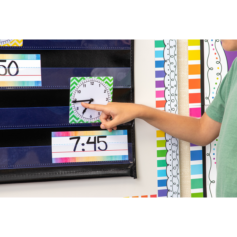 Demonstrate and practice time-telling concepts with your class. 5 pieces per pack. Minute and hour hands spin independently. Write-on with a permanent marker and wipe-off with rubbing alcohol. Time-telling activity suggestions are included. Measures approx. 4.5” x 4.5”.