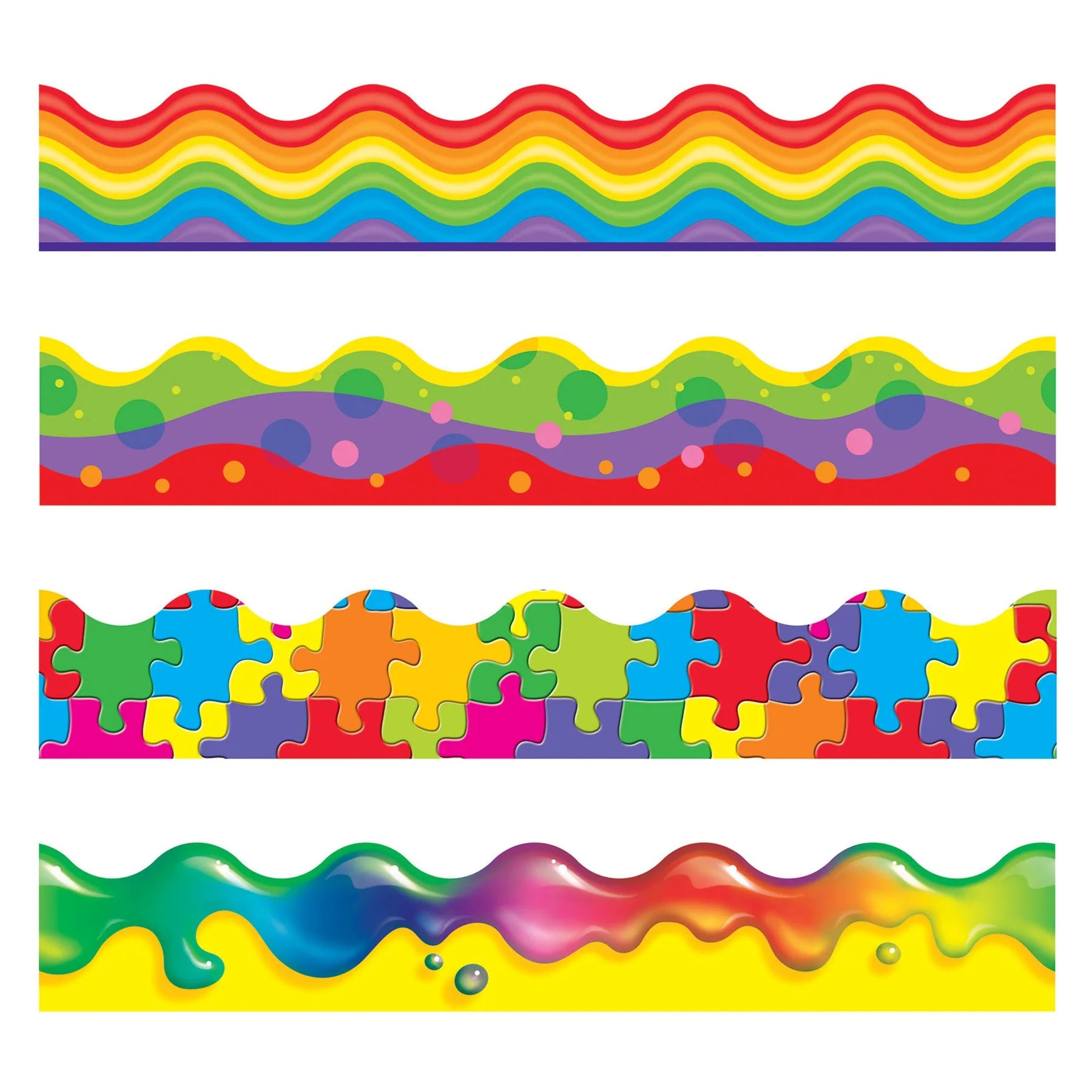Irresistible designs in convenient packs! Vibrant, contemporary trimmers create cheerful classrooms, add pizzazz to parties and events, inspire clever hats ’n crowns, and spruce up storage containers, cubbies, and shelves.