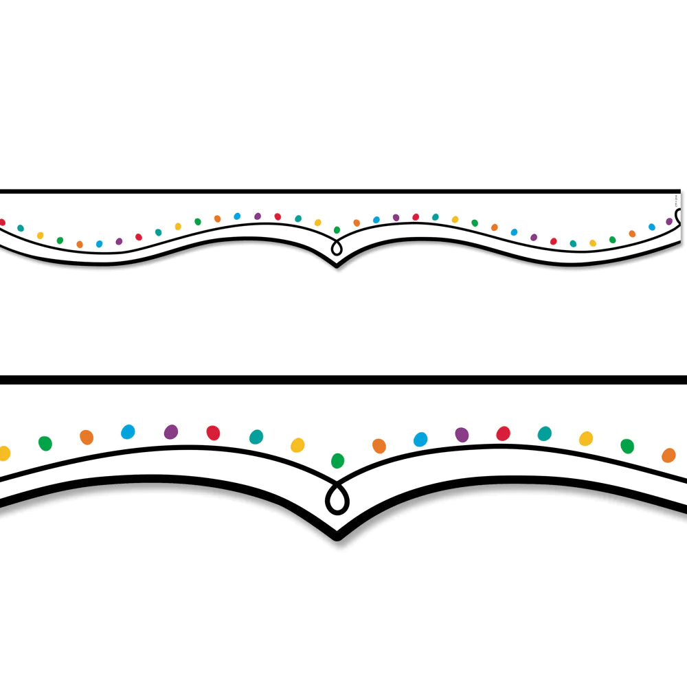 This unique Color-Dotted Swirl Border will trim any bulletin board display in style! Black flourishes and colored dots stand out against the crisp white background on this versatile die-cut bulletin board border that can be used not only in a classroom or at a school but also at an office, a church, a college dorm, or an employee break room. Add style and pops of color to any bulletin board by mixing, matching, and layering our solid and patterned bulletin board borders. This simple trimmer idea will make your bulletin boards really stand out!
