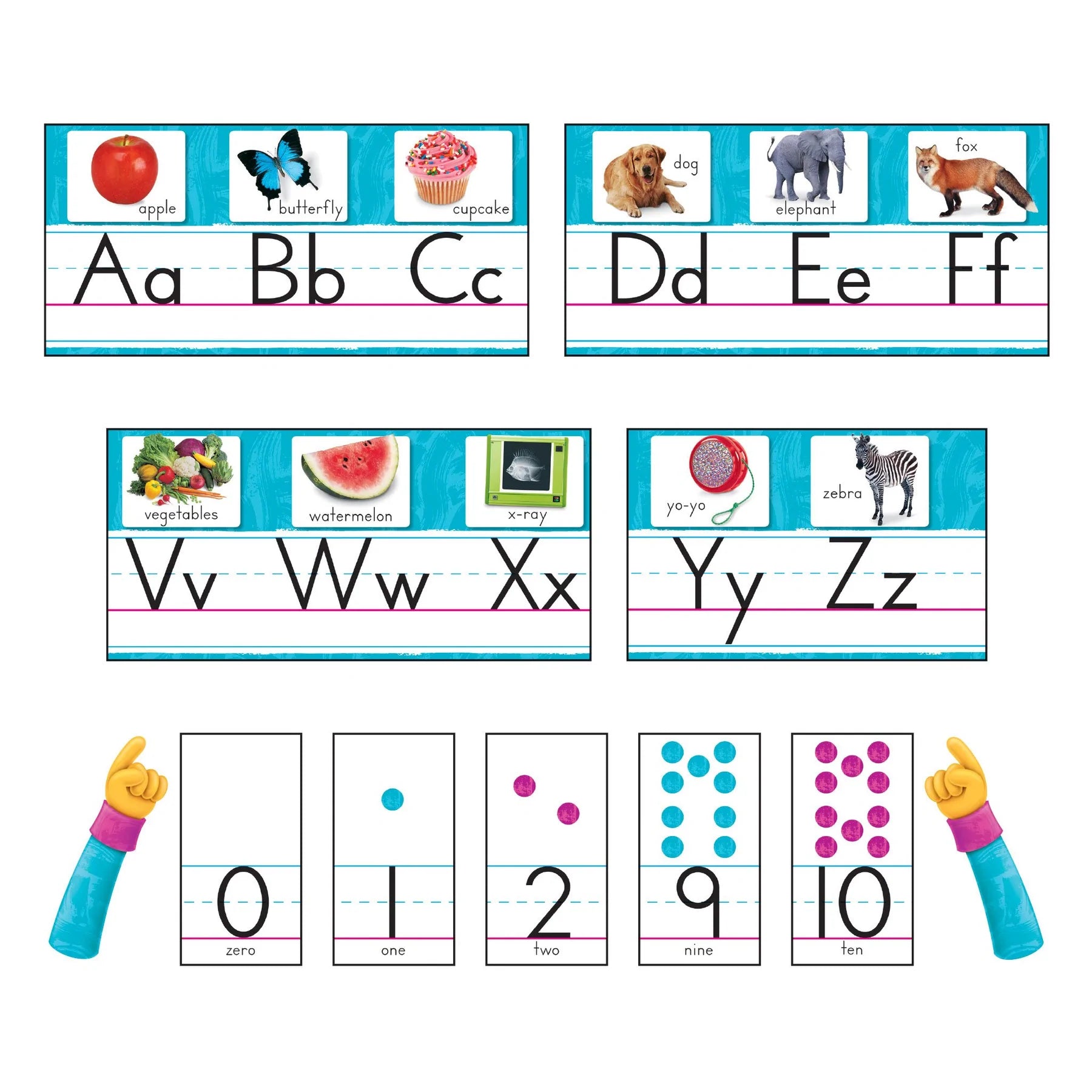 Teach the alphabet, letter order, numbers, and more with this photo-real set. Vocabulary words extend learning opportunities. 9 uppercase/lowercase letter strips, separate number cards 0-10 with counting dots (4⅜ inches x 8⅜ inches each), plus 2 pointers to highlight letters or numbers.