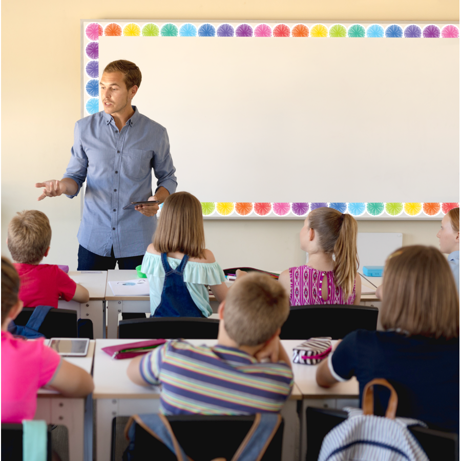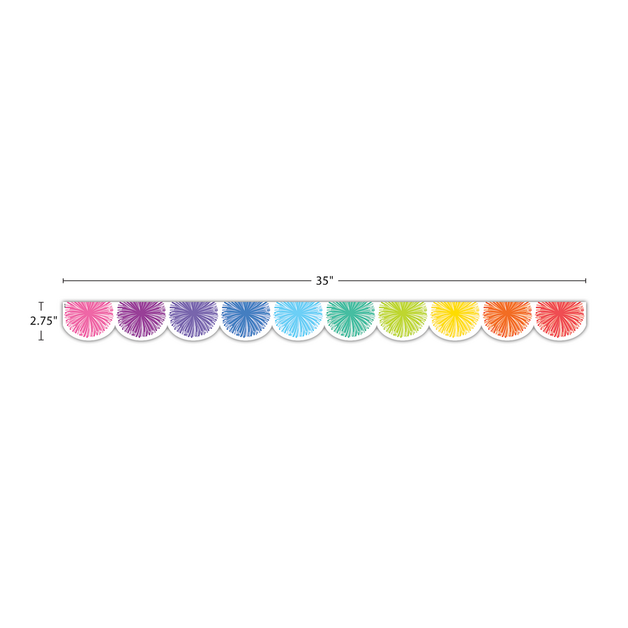 Use this colorful poms border trim to liven up your classroom! Create fresh looks for bulletin boards, windows, walls, and class projects. Mix and match with coordinating products (stickers, notepads, awards, etc.) for a classroom theme. Each pack has 12 pieces (2¾'' x 35'') for a total length of 35 feet of trim!