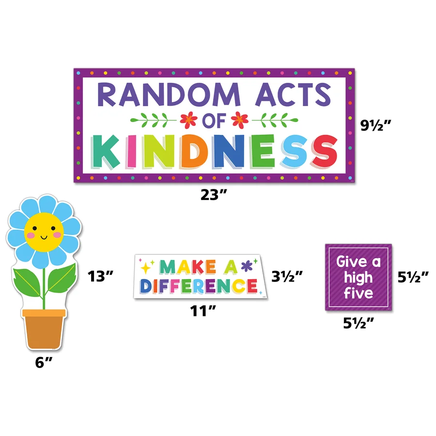 Set into motion a series of random acts of kindness with this purposeful bulletin board sure to foster a positive and supportive classroom environment. Featuring a cheery and colorful design, the vibrant bulletin board promotes kindness and social skills at the same time. Includes 1 header piece, 10 accents, 8 labels, and 36 random acts of kindness. Title piece measures 23⅛" x 9⅜". 55 total pieces.