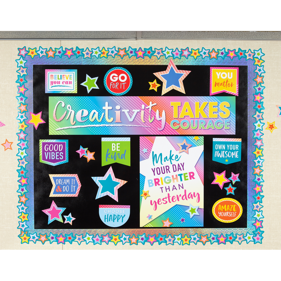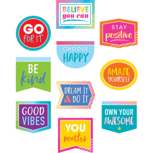 Use the Colorful Vibes Positive Sayings Accents to dress up classroom walls and doors, label bins and desks, or accent bulletin boards. Dimensions: pieces are about 6". 10 designs. 10 accents per pack.