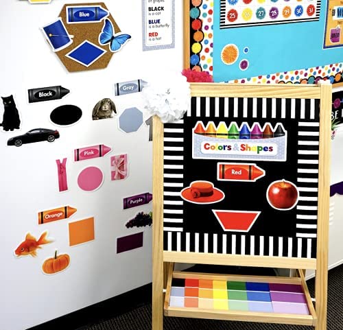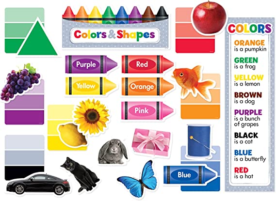 Set contains 1 Colors & Shapes headline, 10 labeled crayons, 20 photographic images of real-world objects, 8 paint chip colors, 10 geometric shapes, 1 color poem, and a guide with activity and display ideas.