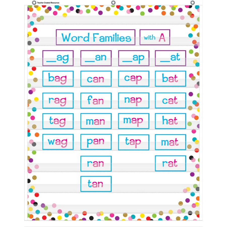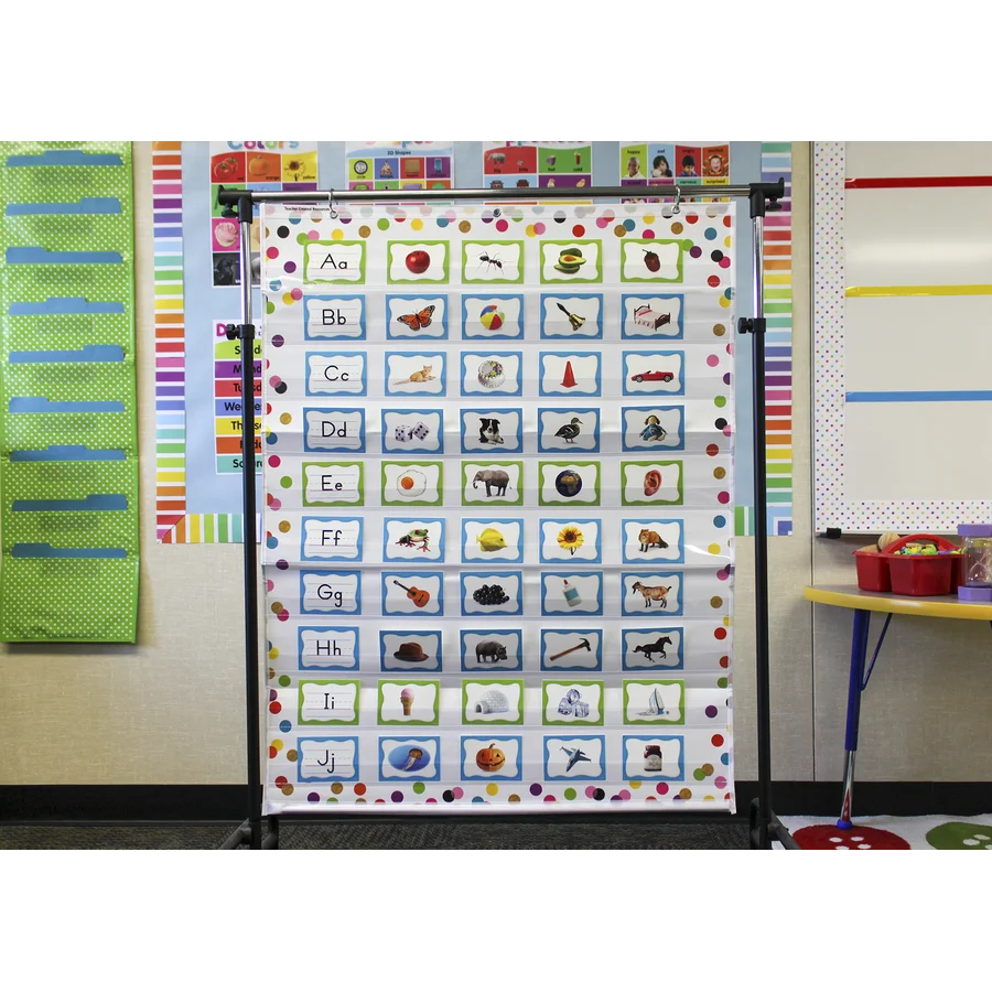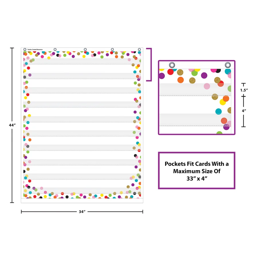 This lightweight and durable Confetti pocket chart features a colorful design and hangs easily from sturdy, metal grommets. The non-porous surface is easy to clean and can be wiped-down or sprayed with disinfectant to help prevent the spread of germs. Measures 34" x 44".