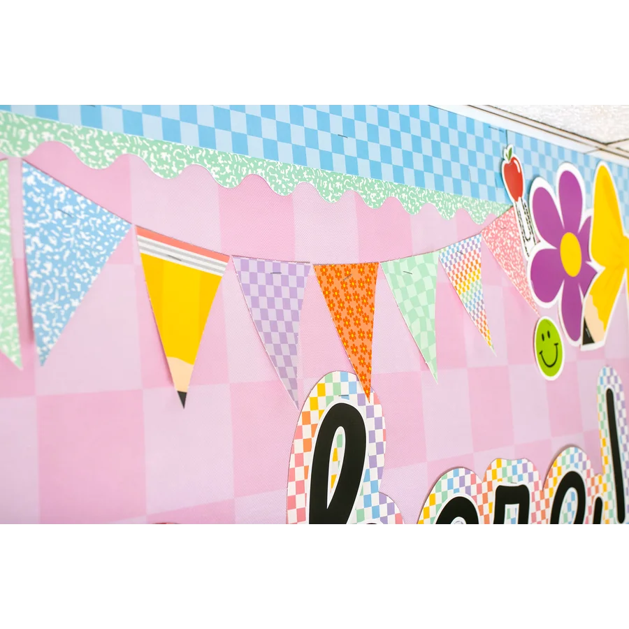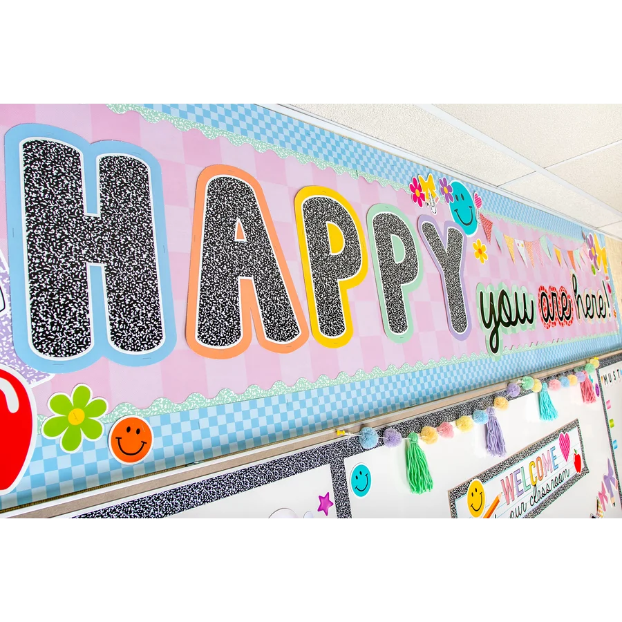 Welcome students and increase a sense of belonging throughout the year with this fun and vibrant bulletin board! Each piece is crafted with engaging, playful art like smiley faces and flowers, paired with bold patterns like rainbow checkers and composition speckles. Add this set to any learning space to foster an inclusive, welcoming environment. Tallest letter is about 13 ½", with 48 total pieces included.