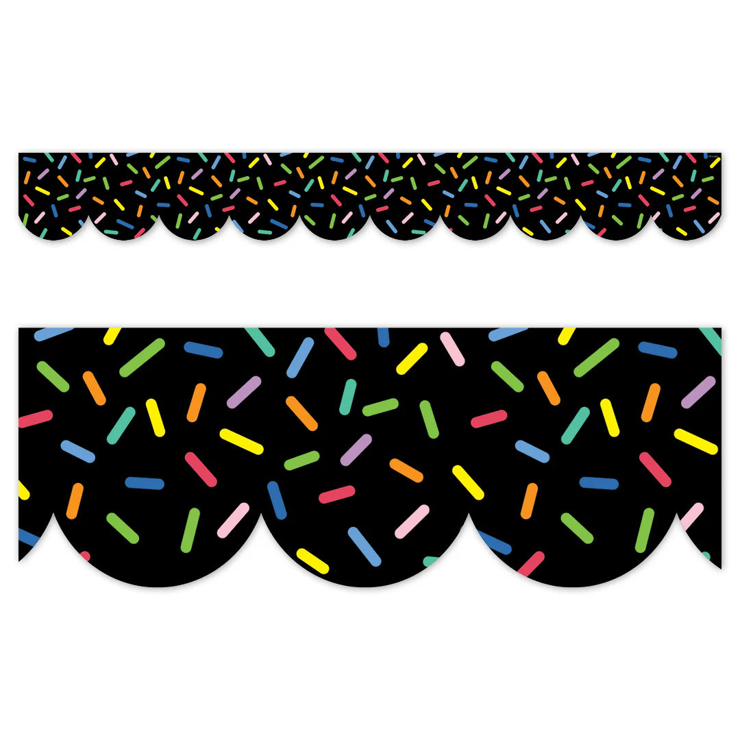 This Sprinkles on Black EZ Border features multicolored sprinkles on a black background for a festive look that will turn any bulletin board display into a celebration. Use the border by itself or layer it with another border for a unique look. Perfect for use on bulletin boards in a wide variety of classroom, office, and school settings. Each package comes with enough borders to complete 2 full bulletin boards.