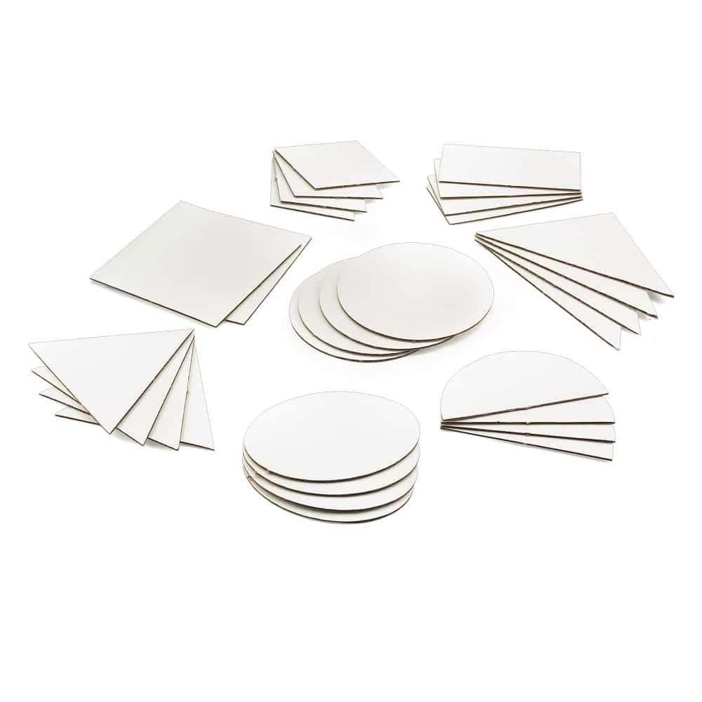 Let your imagination get the better of you as you sit down with Hygloss Corru-Shapes: corrugated geometric shapes. The sturdy corrugated cardboard has a smooth, white surface on both sides, which can be decorated with crayons, markers, paint, glitter, and more. Have fun creating any picture or object by putting various shapes together. Corru-Shapes are ideal for both home and classroom use. Highly educational and stimulating, use Corru-Shapes to introduce shapes to pre-preschoolers, explain geometry concepts to older children, and for unlimited arts and crafts ideas. These corrugated geometric shapes provide hours of constructive fun for children of all ages. 8 assorted shapes include: Circles, Semi-circles, Squares, Triangles (2 types), Rectangles, Diamonds, and Ovals.