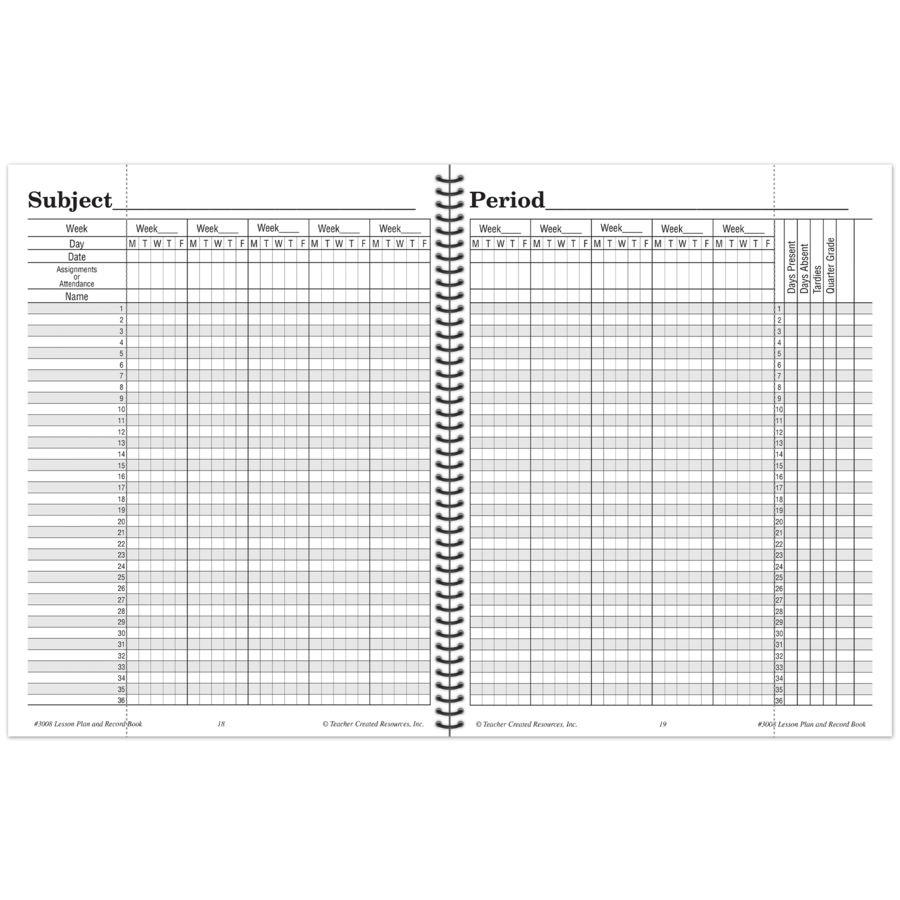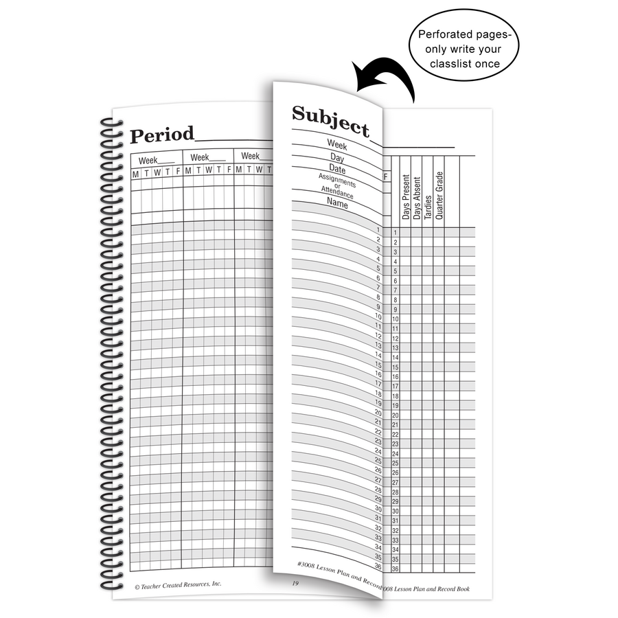 Create lesson plans and record attendance and grades for 40 weeks of school. Perforated pages allow one list of students names to be used across several pages of records. Bonus pages provide substitute teacher information, seating chart, student roster, birthday chart, weekly schedule, monthly planner, and grading chart. 8 1/2 x 11". 160 pages, spiral bound.