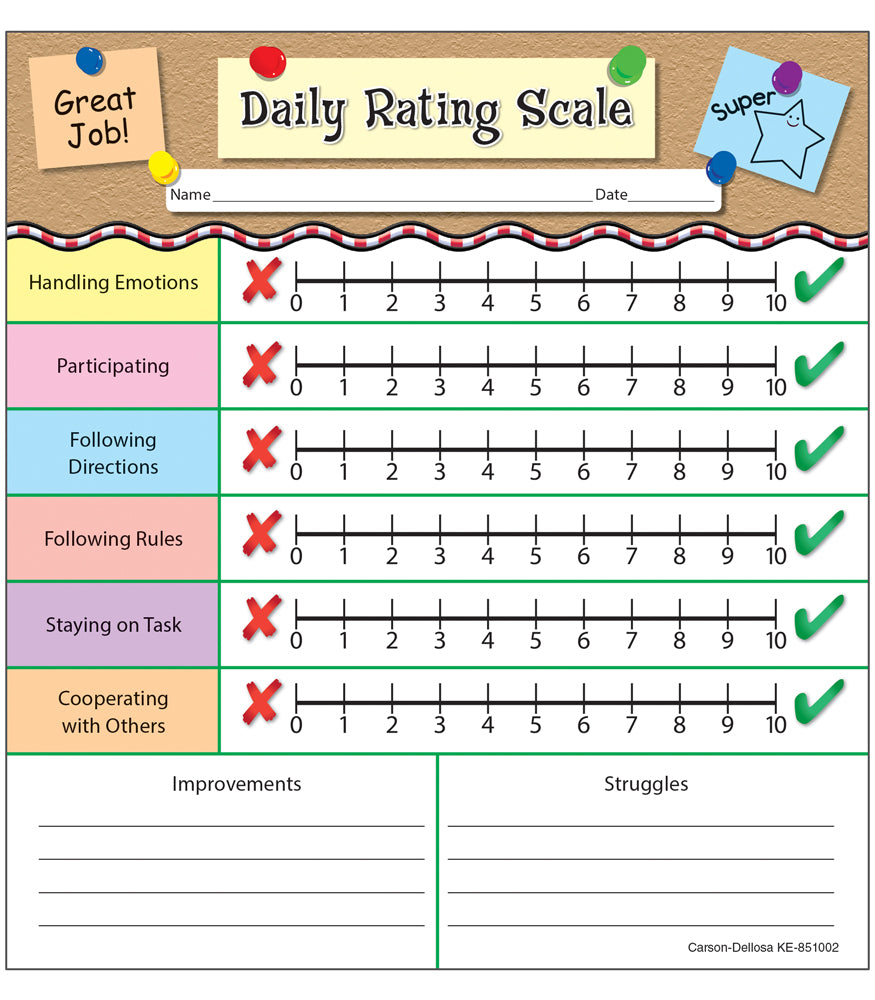 It is easier to shape behaviors when there are set goals and frequent feedback. The Daily Rating Scale Notepad, includes 6 preprogramed typical behaviors to rate, plus offers spaces for the teacher or student to write in additional goals. The simple preset rating scale will make it easy for busy teachers to provide the necessary feedback in a matter of minutes. Each pad includes 50 sheets and is 5 3/4" x 6 1/4".