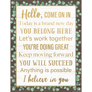 This wood and greenery design on this sign adds a decorative touch as well as makes all students feel welcome. Related lessons and activities are provided on the back. Each chart measures 17" by 22".