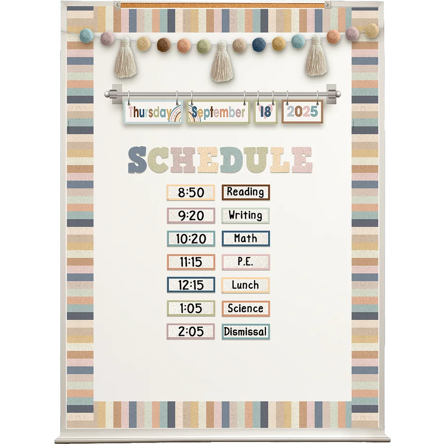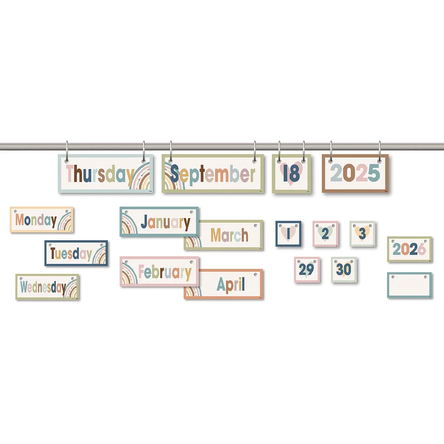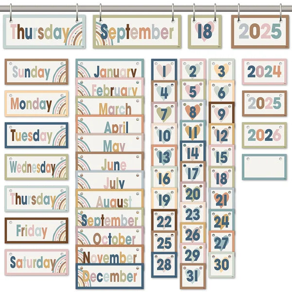 These perpetual flip calendars offer multiple options for displaying the date on your board, saving you valuable time during your morning meetings. They are easy to assemble onto a magnetic curtain rod (not included) and work perfectly when placed above your daily class agenda. Set includes: 12 month cards, 31 pre-numbered calendar days, 7 days-of-the-week cards, 3 pre-numbered year cards and 1 blank card. 54 total pieces.