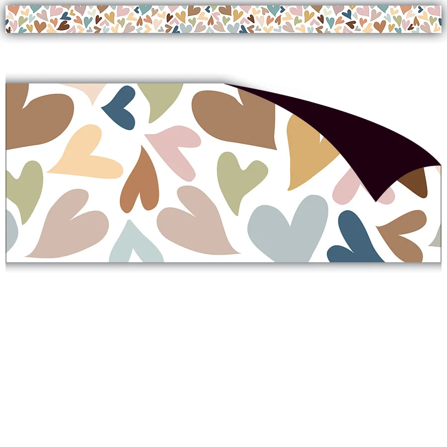 Decorate your whiteboard in a snap with durable, reusable magnetic decor! Use this border trim featuring colorful hearts against a crisp white background to add charm to your classroom! Add flair on other metal surfaces such as doors, desks, shelving, and bins. Cuts easily with scissors for the perfect fit. Includes 12 pieces per pack. Each magnetic border is 24" x 1½". 24 total feet.