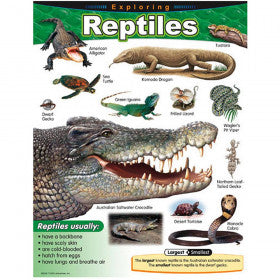 Learn interesting facts about a variety of reptile species. Vivid illustrations with realistic detail. Back of chart features reproducible sheets, activities, and helpful teaching tips