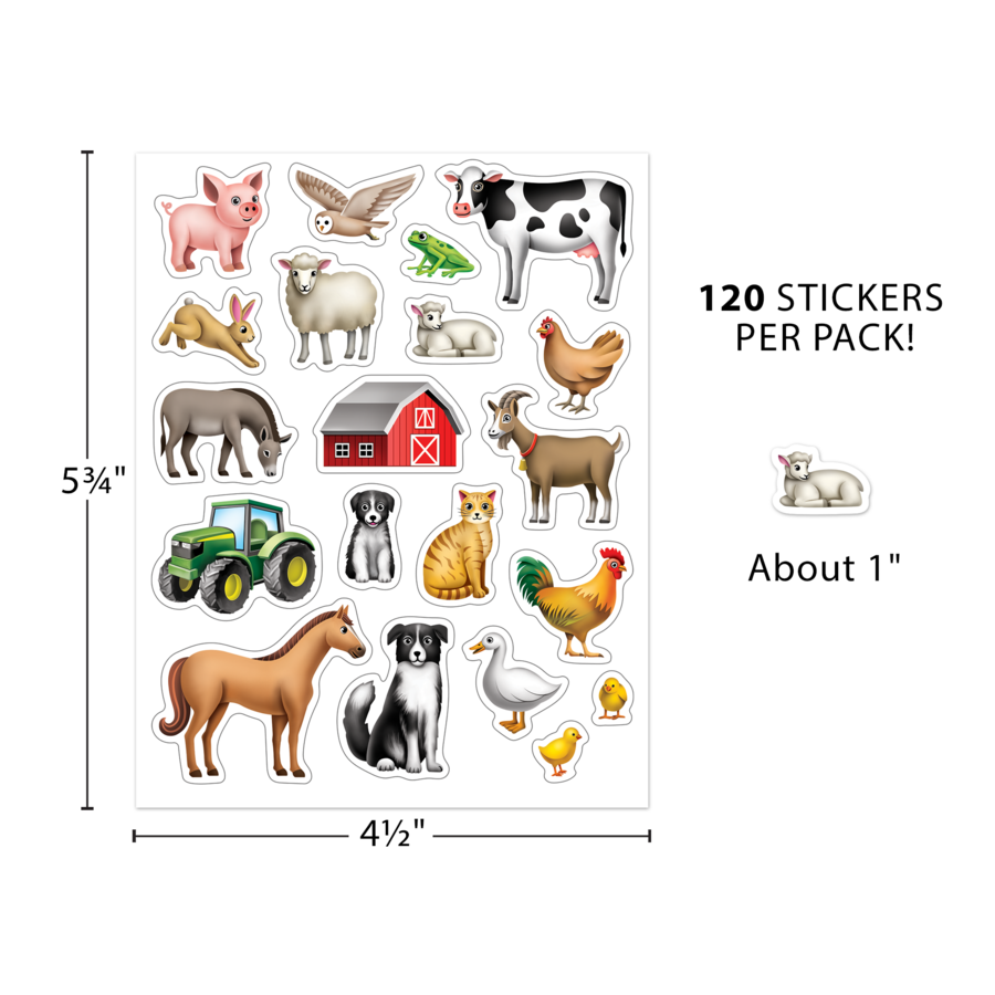Harvest a bounty of charm for your projects with our Farm sticker set, showcasing the endearing world of barnyard animals, tractors, and country life, where playful pigs, curious cows, and spirited roosters come to life, turning each creation into a rustic masterpiece of down-home delight. Each sticker is acid-free & lignin-free and measures about 2½" x ½''. 20 designs, 120 stickers per pack.