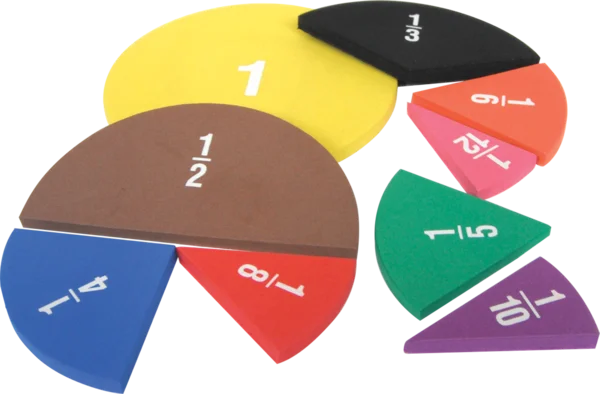 Nine circles, each measuring 3-1/2". One circle is whole. The other eight are divided into common fractions: 1/2, 1/3, 1/4, 1/5, 1/6, 1/8, 1/10, 1/12). Nine colors. 51 total pieces. Foam is lightweight, soft, quiet, and washable. Comes in a resealable storage bag. Teaching tips are included.