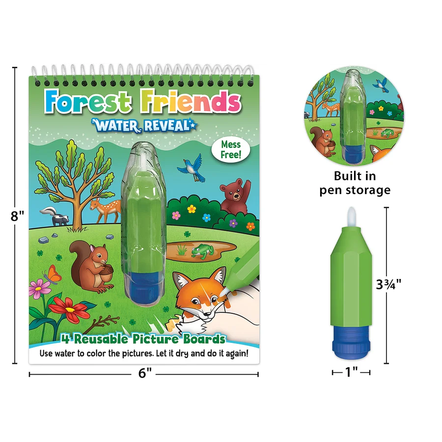 Mess free! Use water to color the pictures. Let it dry and do it again! Includes search and find activities plus an educational fact. Comes with 4 reusable picture boards and 1 refillable water pen. Ages 3+