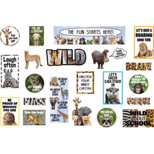 Transform your classroom into a vibrant animal kingdom with this bulletin board set! Bursting with lively colors and uplifting messages, this set is designed to inspire young learners and foster a positive learning environment. Largest piece is 19½'' x 5'', 22 total pieces.