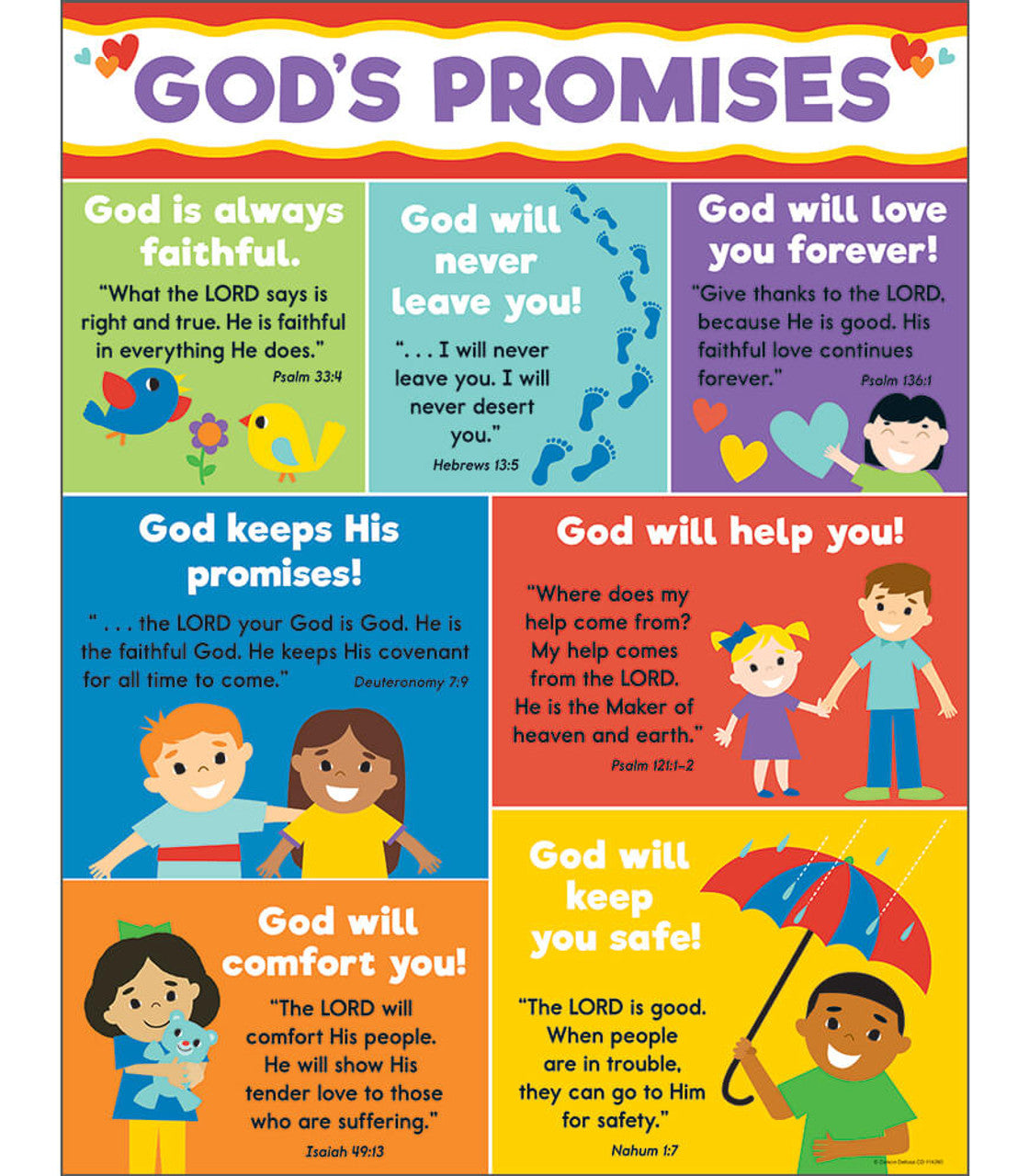 Enhance the way you teach with the God’s Promises Chart. This chart for students features seven promises and popular Bible verses to reassure students during their religious journeys. This chart measures 17" x 22", and you can use it year-round.