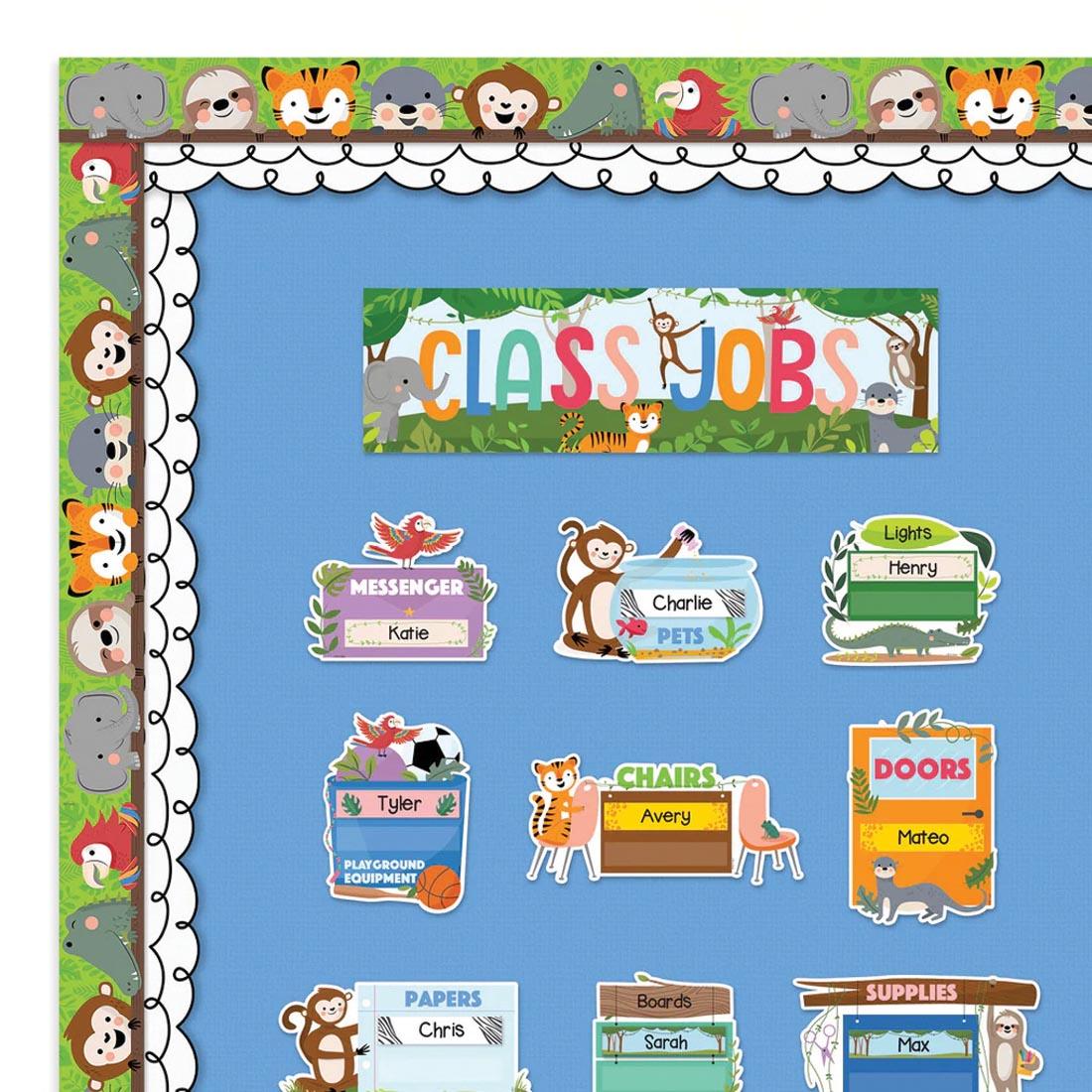 We’re wild about class jobs! Add charm to any space and establish a classroom community where everyone pitches in and helps. Transform your classroom into a cohesive jungle-themed learning environment featuring bright tones, a touch of greenery, and all your favorite jungle animals. This easy-to-use class job set is the perfect way to help students develop a sense of pride and ownership from the moment they walk in. Use the customizable cards to incorporate all the important roles that make a classroom run smoothly while promoting responsibility and interdependence.