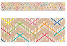 Add a creative touch to your bulletin board displays with the Colorful Kraft Chevron EZ Border, which features a colorful chevron pattern on a kraft-style background. Perfect for use on bulletin boards in a wide variety of classroom, office, and school settings. These EZ borders come in smaller strips, which are easier to manage and store. Each package comes with enough borders to complete 2 full bulletin boards.