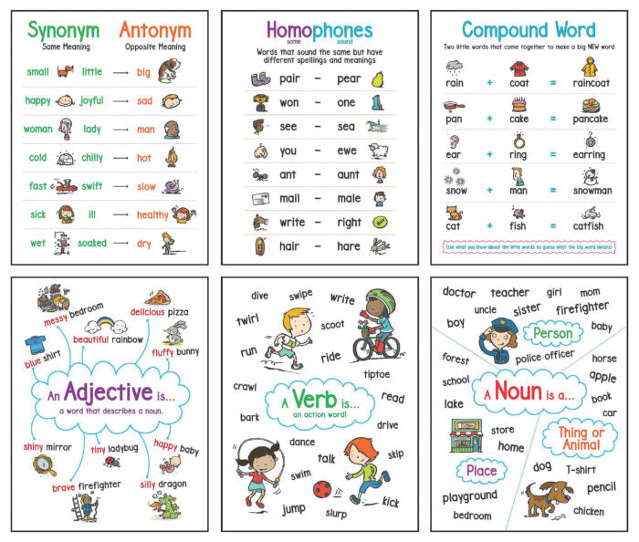 Support classroom learning with this cute series of anchor charts on 6 essential language arts topics. Features a reproducible version on the reverse so each student can have one for reference. A handy time-saver for busy teachers! Includes 6 Charts: