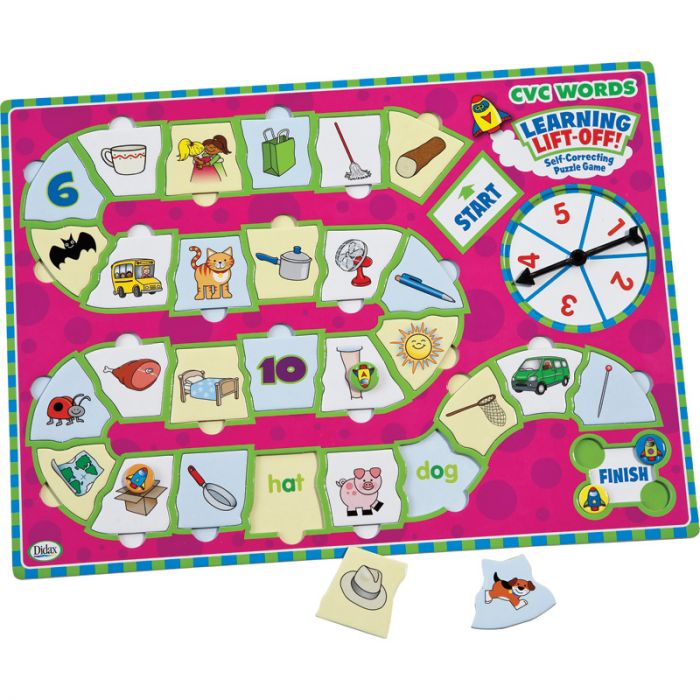 27 pieces with simple three letter CVC words. Players spin to advance, answer question on the puzzle piece, then lift the piece to see the answer. Spinners and tokens are integrated on the game board. Can be used individually as a puzzle.