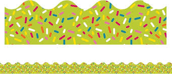 Lime Sprinkles scalloped border features colorful sprinkles scattered on a lime green background for a sweet design that draws attention to any classroom display.