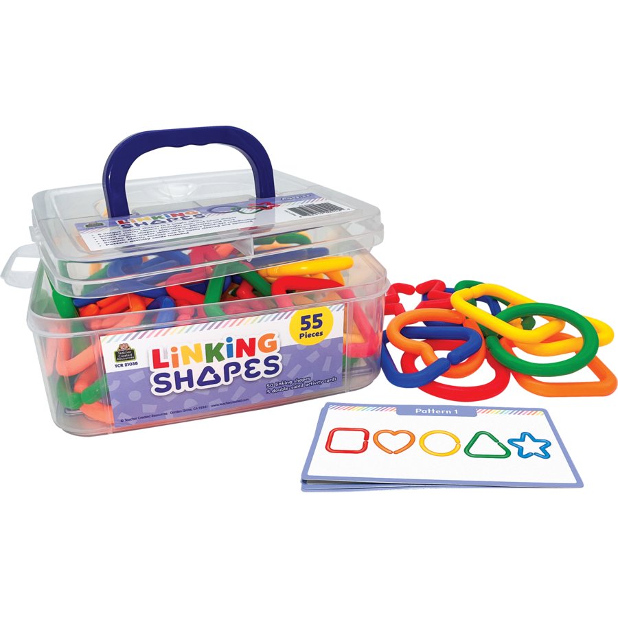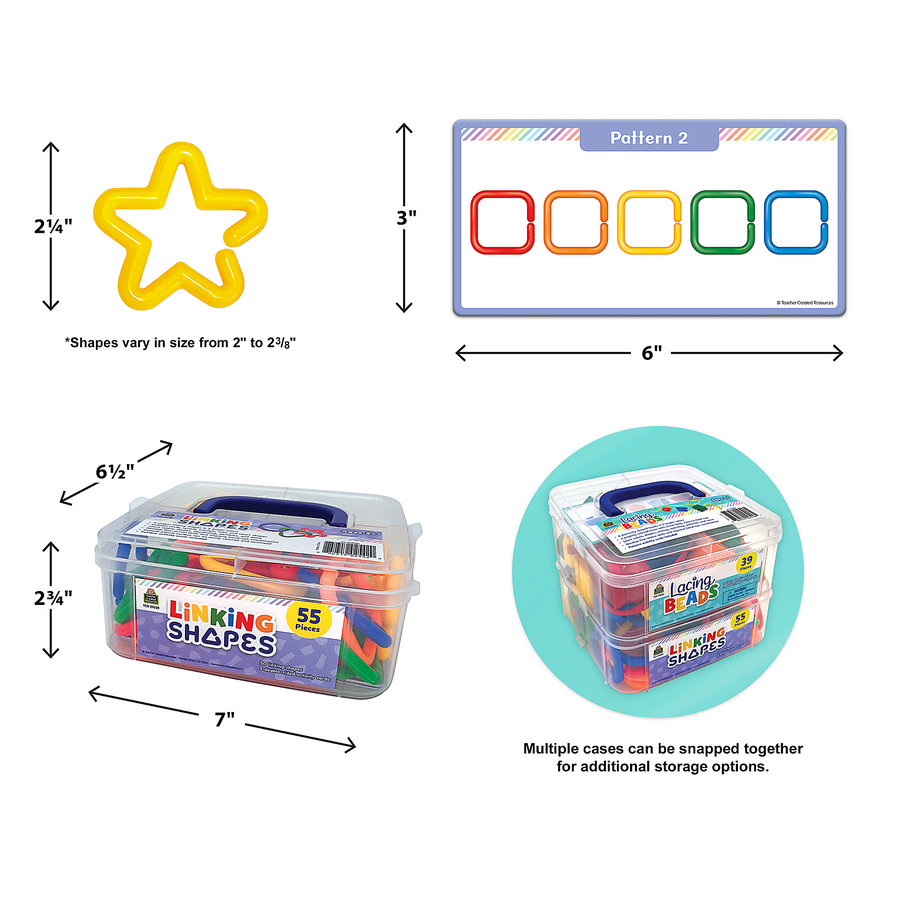 Help children develop fine-motor skills and improve hand-eye coordination with this set of linking shapes. This collection of 50 linking shapes includes five distinct shapes (square, circle, heart, triangle, and star) in five bright colors. Pieces easily link together to form a chain. Also included are five double-sided activity cards that provide various color and shape patterns for young learners to replicate. The fifty shapes and five activity cards all come in a stackable plastic case with a handle for easy transportation and storage.
