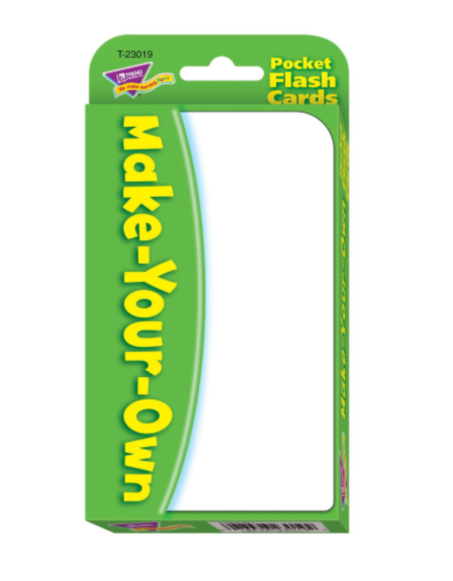 Make-Your-Own Pocket Flash Cards include 56 blank cards. The rounded sorting corners give your set a finished and professional look and helps with sorting. The no-see-through cardstock keeps answers on backs hidden on self-checking study cards.