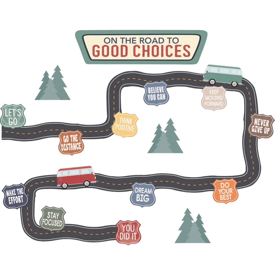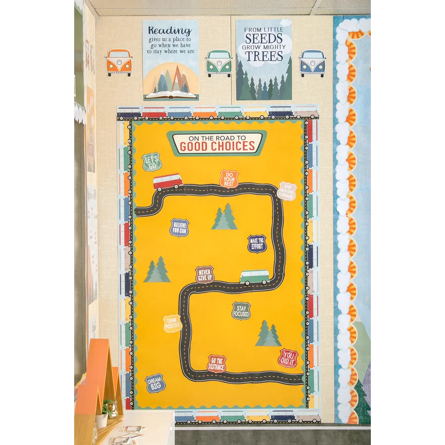 Transform your classroom into a dynamic learning destination with this bulletin board, featuring travel-themed graphics and uplifting messages. Arrange the road pieces, tree elements, and traffic signs to create a classic road-trip scene where students become the drivers of their own educational journeys. The header piece measures 20" x 5⅛" 30 total pieces.