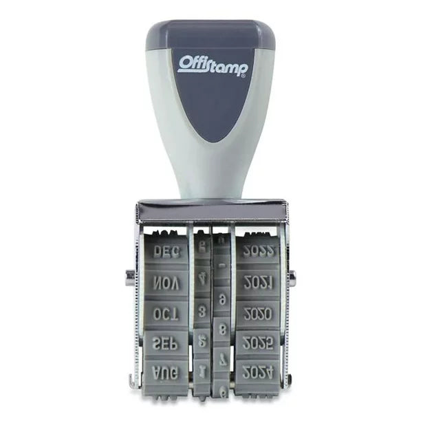 Save time adding dates to important documents with this date stamp. The adjustment wheels rotate to customize to the exact day, month, and year, and the 1.25-inch impression is easy to read. This Offistamp date marking stamp has a round handle for a comfortable and sturdy grip.