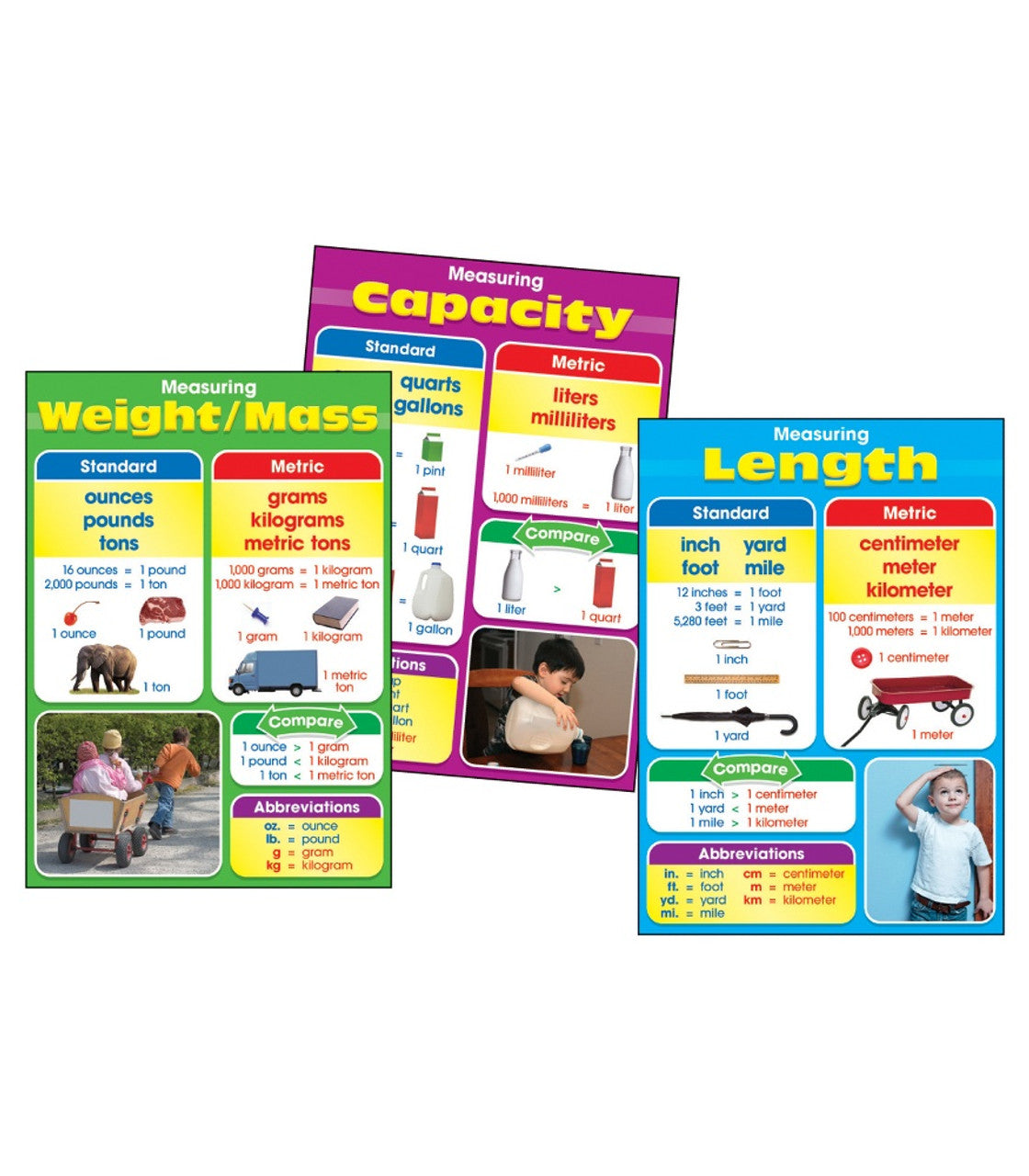 Perfect for a science or math center, the Photographic Measurement chart set shows metric and standard measurement conversions and abbreviations.