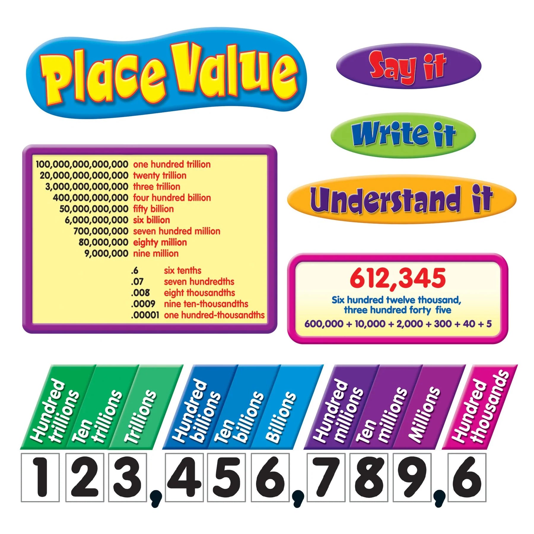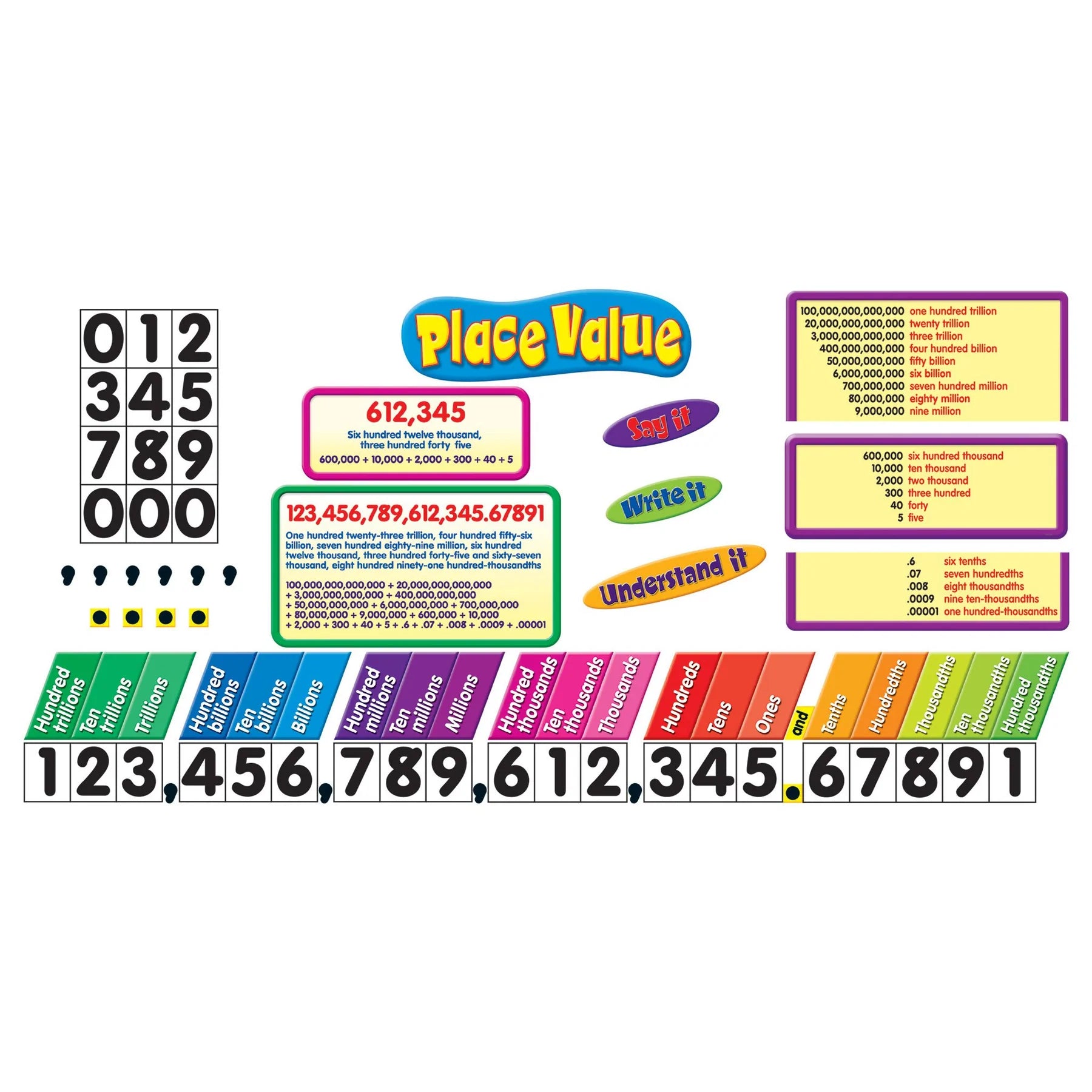 Understand numbers from micro to mega! Arrange numerals 0-9, commas, and decimals to personalize learning. Place value number words show how to say and write numbers from hundred thousandths to hundred trillions. Color-coded pieces and reference charts.