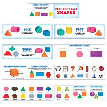 Introduce students to plane and solid shapes with the 40 pieces in this mini bulletin board set. Perfectly sized for use in a pocket chart or on a bulletin board, the mini posters are ideal for reinforcing important geometry concepts and academic vocabulary. When used in a math learning center, the geometric shapes, cards, and photographic images of real-world objects are perfect for helping students make connections between geometric shapes and shapes in the world around them. Perfect for grades K—2. Pieces range in size from 3 ½?x 3? to 21?x 6?