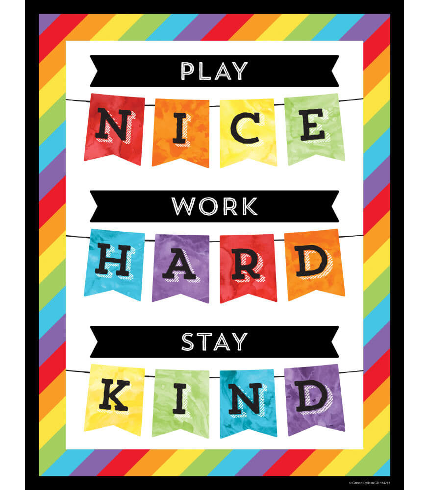 nspire students to do their best with motivational charts. The 17" x 22" Celebrate Learning Play Nice Work Hard Stay Kind chart encourages students to remain focused on their goals and to create positive relationships in the classroom.