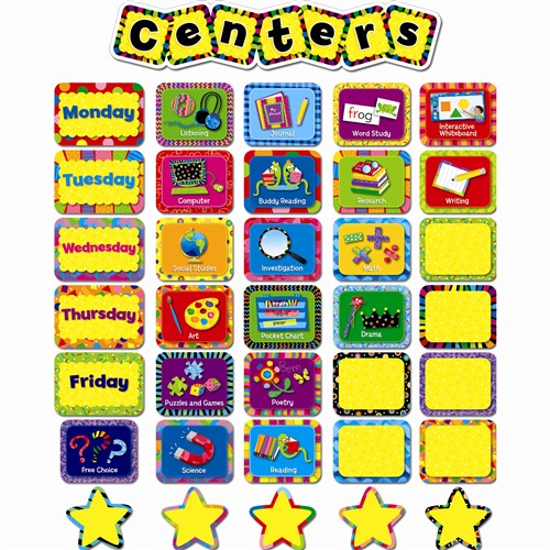 A fun and vibrant way to manage literacy, math, science, and social studies classroom centers. Includes 19 pre-labeled center cards (approx. 4 3/4" x 3 3/4" ), 6 blank center cards (approx. 4 3/4" x 3 3/4" ), 5 days-of-the-week cards (approx. 5 1/2" x 3 3/4" ), 5 blank stars (4" x 4" ), and a headline (approx. 20 1/2" x 4 1/4" ). 36 pieces.