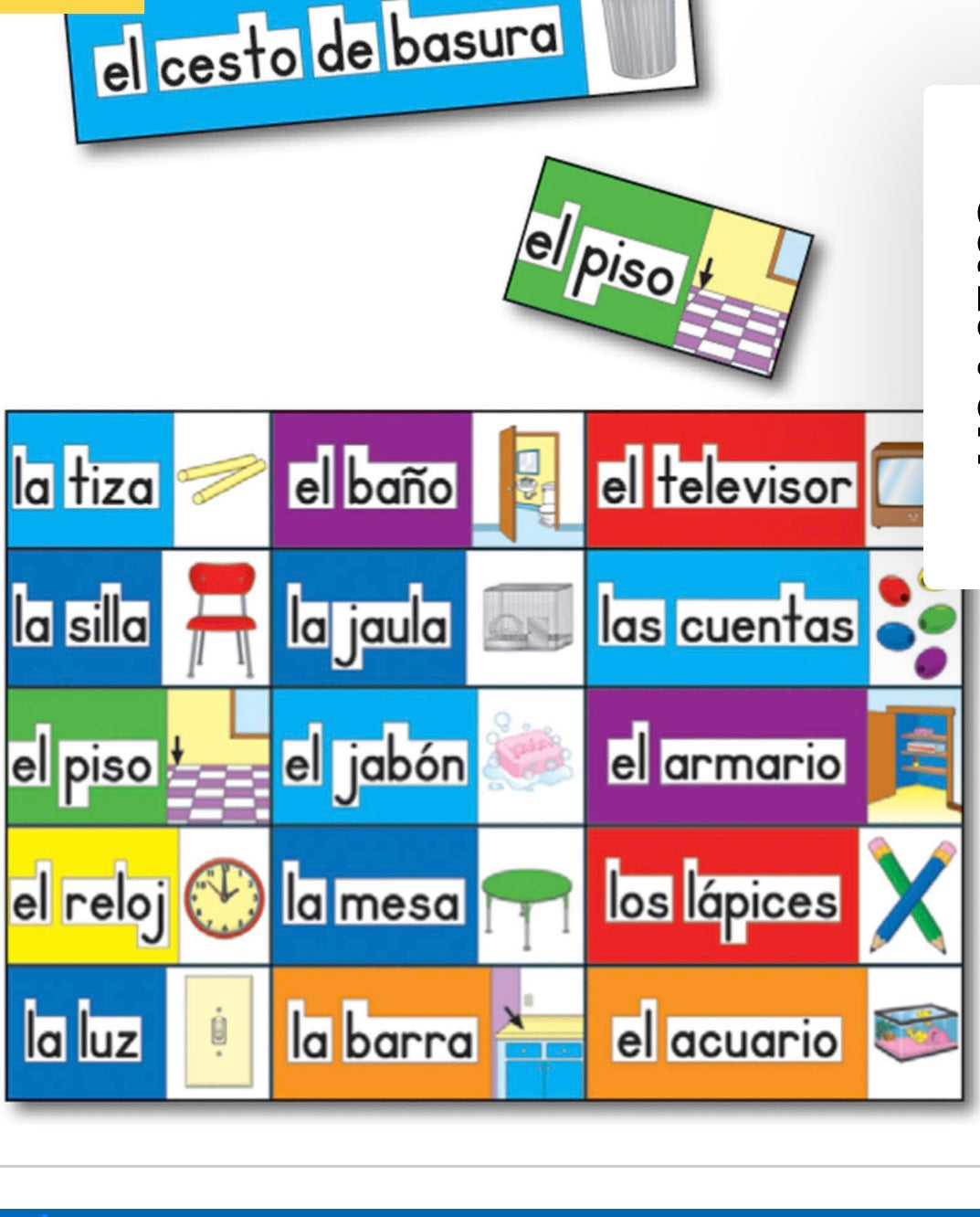- 56 Spanish classroom label cards (sizes approx. 7” x 3.5” to 14.5” x 3.5”) featuring matching illustrations