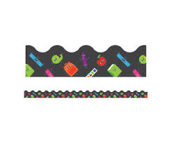 Enhance, frame, and highlight with border trim for bulletin boards. The School Tools Ready for School scalloped border features an assortment of School Tool characters on a sleek black background. The pack includes 13 strips, each measuring 3′ x 2.25" for a total length of 39′.