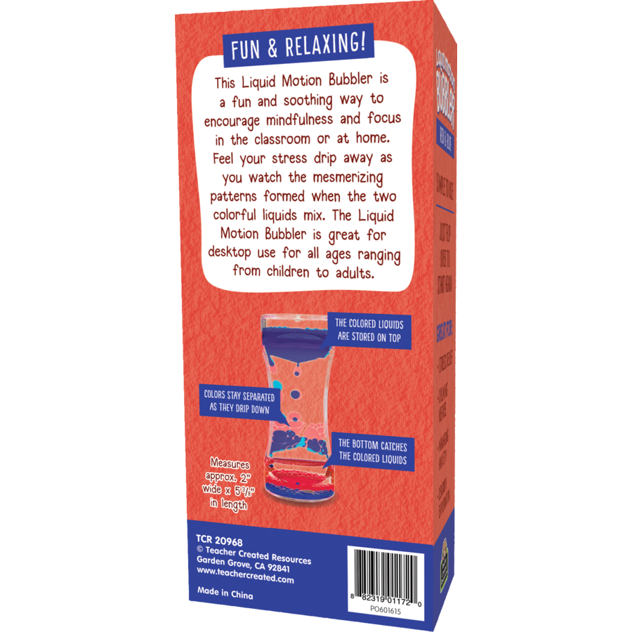 This Liquid Motion Bubbler is a fun and soothing way to encourage mindfulness and focus in the classroom or at home. Feel your stress drip away as you watch the mesmerizing patterns form when the two colorful liquids mix. It’s fun, relaxing, and simple to use—just flip over to start again. It's a perfect desktop tool for all ages ranging from children to adults. Measures 2" x 5⅜".